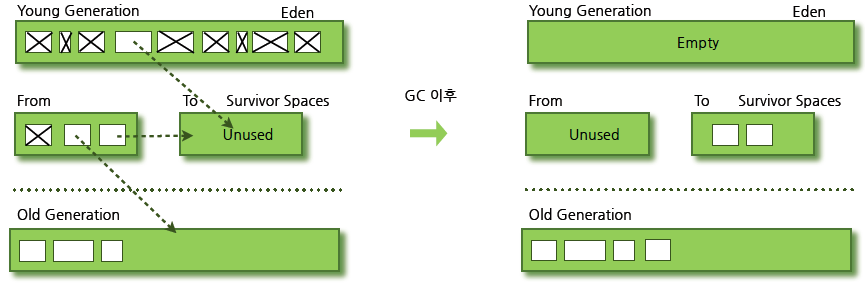 Eden ์์ญ์ ์ต์ด๋ก ๊ฐ์ฒด๊ฐ ๋ง๋ค์ด์ง๊ณ , Survivor ์์ญ์ ํตํด์ Old ์์ญ์ผ๋ก ์ค๋ ์ด์๋จ์ ๊ฐ์ฒด๊ฐ ์ด๋ํ๋ค!