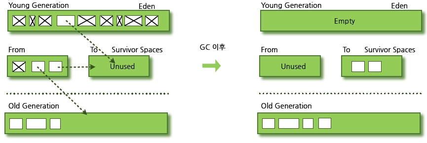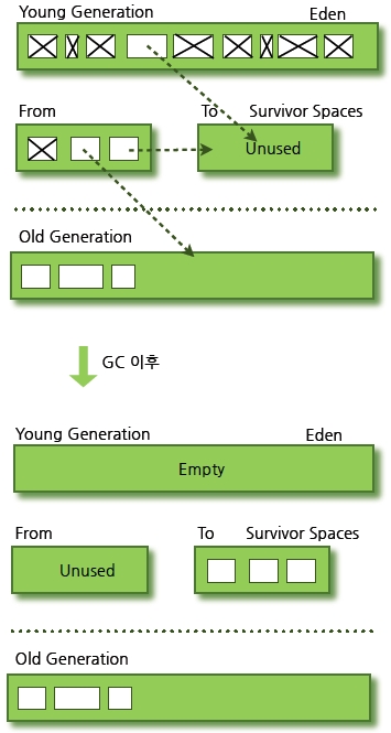 ์ด ๊ณผ์ ์ ๋ฐ๋ณตํ๋ค๊ฐ ๊ณ์ํด์ ์ด์๋จ์ ๊ฐ์ฒด๋ Old ์์ญ์ผ๋ก ์ด๋(Promotion)ํ๊ฒ ๋๋ค.